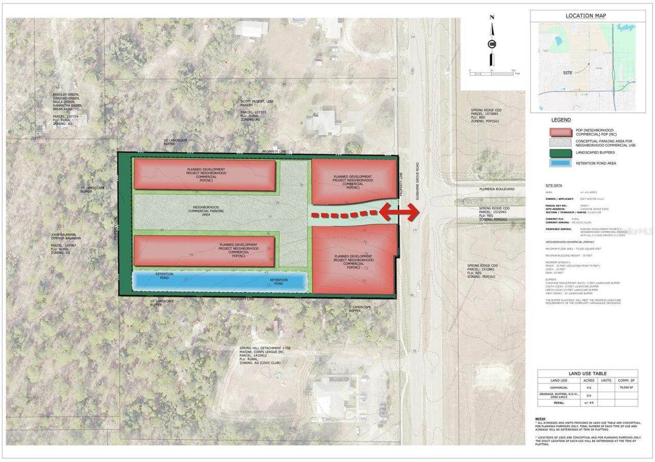 ***PRIME OPPORTUNITY TO OWN THE EARTH BENEATH YOUR DREAMS - SUNSHINE GROVE RD, BROOKSVILLE / REZONING TO C3-NEIGHBORHOOD COMMERCIAL + CERTAIN C1 USES -IN PROGRESS- WITH 70,000 sf OF COMMERCIAL BUILDINGS***NEARLY 5 ACRES OF HIGH-VISIBILITY & Partially Cleared COMMERCIAL POTENTIAL Land (Rezoning in process) with 330 ft of FRONTAGE on busy 4-lane SUNSHINE GROVE RD-directly across from the SPRING RIDGE COMMUNITY, which is scheduled for SIGNALIZATION, with 15,500+ daily average traffic count. Surroun...***PRIME OPPORTUNITY TO OWN THE EARTH BENEATH YOUR DREAMS - SUNSHINE GROVE RD, BROOKSVILLE / REZONING TO C3-NEIGHBORHOOD COMMERCIAL + CERTAIN C1 USES -IN PROGRESS- WITH 70,000 sf OF COMMERCIAL BUILDINGS***NEARLY 5 ACRES OF HIGH-VISIBILITY & Partially Cleared COMMERCIAL POTENTIAL Land (Rezoning in process) with 330 ft of FRONTAGE on busy 4-lane SUNSHINE GROVE RD-directly across from the SPRING RIDGE COMMUNITY, which is scheduled for SIGNALIZATION, with 15,500+ daily average traffic count. Surrounded by MAJOR COMMERCIAL & HOUSING DEVELOPMENTS (10,000+ new homes planned) and only 2.5 miles from the new SANDAL KEY Metro LAGOON, this site sits in the heart of HERNANDO'S FASTER GROWING CORRIDOR.Given its location at a signalized intersection, this project is well situated to provideneighborhood commercial services to the nearby residences.MAJOR HCUD UTILITY LINES are located in the adjacent Sunshine Grove Road right-of-way, andthe site is WELL ABOVE THE FLOODPLAIN and contains NO WETLANDS. SOILS ARE FAST-DRAINING andconducive for on-site retention of stormwater from residential and commercialdevelopment.~~~PERMITTED USES WILL BE ---> Veterinary Clinic Dry Cleaning Delicatessens and restaurants with a forty (40) or less seating capacity Nursing Care Homes Day Care Nursing Care Homes Day Care Center Antiques Small Convenience goods stores Thrift Store Comparison goods (appliance, furniture, electronic, apparal store) Retail Food Domestic and Business Service Domestic and Business Repair Business Training Schools Alcoholic beverage dispensation (package and restaurants only) Public offices and utility facilities.~~~NEXT DOOR LANDMARK ---> MARINE CORPS LEAGUE | The Command Post Bar & Grill -drawing steady local traffic ~~~UTILITIES NEARBY ---> Public Water, Sewer, Electricity~~~COMMUNITY ASSETS ---> Less than 2 miles from the SCHOOLS K to 12 (Pine Grove Elementary, West Hernando Middle, Central High); HOSPITALS (HCA Oak Hill - 350 beds, TGH - 120 beds, Springbrook - 80 beds), and famous Weeki Wachee Springs State Park & the Mermaid Water Park. ~~~CONNECTIVITY ---> Minutes to the Suncoast Parkway SR-589 (for quick access to TAMPA) & Route 50/Turnpike (for a direct access to ORLANDO)~~~PROXIMITY ---> 0.5 mi from SR-50's busiest COMMERCIAL HUB with *NATIONAL RETAILER*: Sam's Club, Walmart, Sprouts, Aldi, Office Depot, Ulta, BJ's Wholesale, Men's Warehouse, Dick's Sporting Goods, HomeGoods, Hobby Lobby, Marshalls, Michaels, Petco, Skechers, Belk, Bealls, Ross, Five Below; Tire Kingdom, Advanced Autopart, O'Reilly, Bob's Carpet,...; *DINING* with Newly built restaurants: . Olive Garden, Glory Days, Texas Roadhouse, Bonefish Grill, Chili's. Longhorn Steakhouse, First Watch, Cheddar's, Moe's, Arby's, Culver's, Wendy's, Chick-Fil-A, Burger King, McDonald's, Starbucks, Panera, Dunkin, Panda Express (coming soon), etc... You name it... and more on their way being built...; ~~~HOTELS ---> Fairfield Inn, Holiday Inn, Quality Inn, Motel 6, Microtel Inn. IDEALLY POSITIONED IN FRONT OF A MAJOR RESIDENTIAL NEIGHBORHOOD, and between a SCHOOL HUB & Brooksville's COMMERCIAL HUB, this parcel delivers unmatched exposure and long-term growth potential. *The Site Plan illustrated has been submitted to the County, subject to review from planning & development. ~~~WALK THIS LAND FROM THE COMFORT OF YOUR HOME WITH THE 360 VIRTUAL TOUR~~~