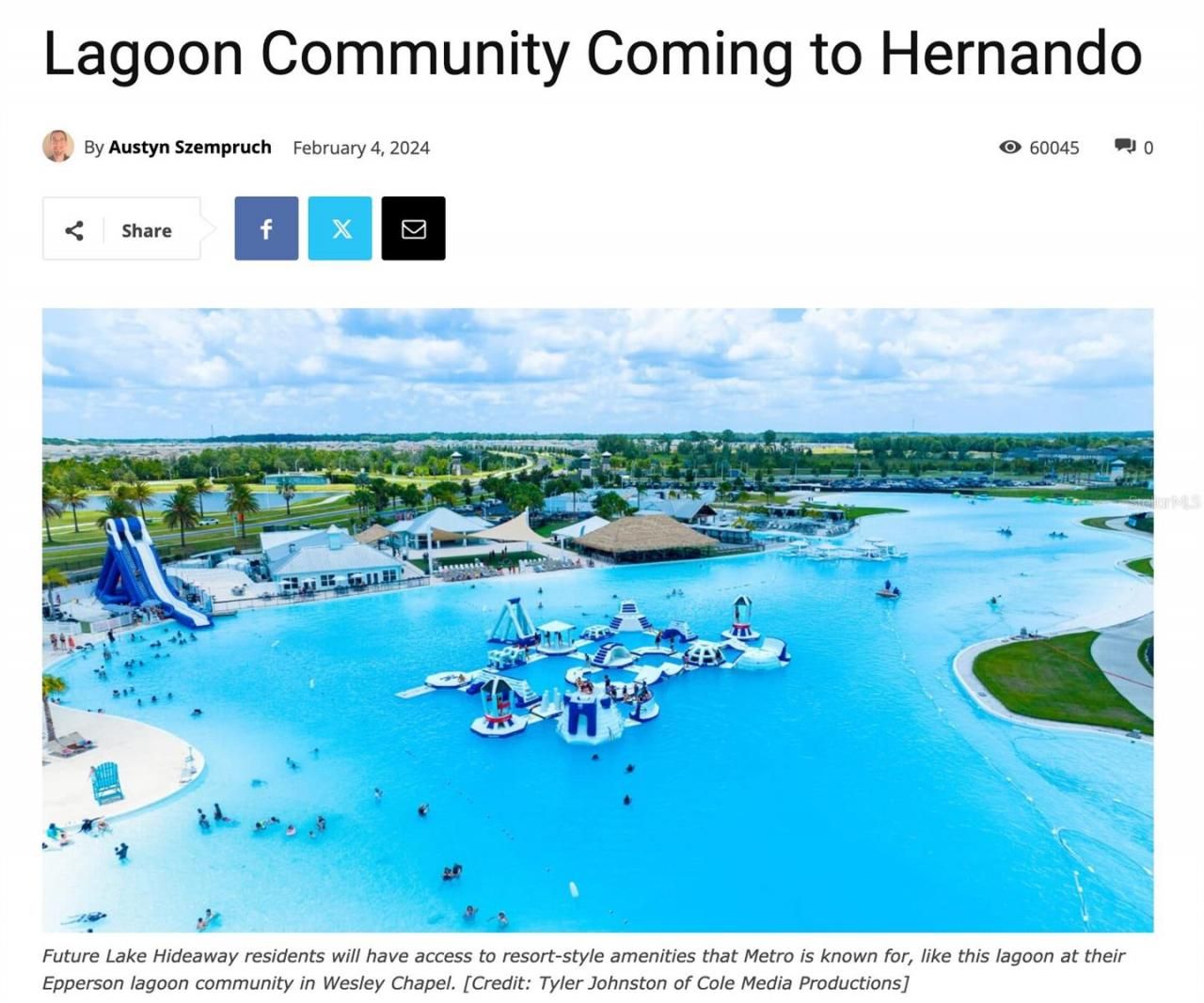 INCREDIBLE OPPORTUNITY for a developer to purchase 9.1 acres in the middle of Sandal Key Lagoon by Metro Places that is going in with 3700 homes and the country's newest man-made lagoon pool in Hernando County. Located east of US 19 and north of State Road 50 (Cortez). It's approved and land site work is currently being done for 2400 single family detached homes, 644 attached townhouses, 656 senior adult attached housing, a new charter school, community recreation, and for new supportive commerc...INCREDIBLE OPPORTUNITY for a developer to purchase 9.1 acres in the middle of Sandal Key Lagoon by Metro Places that is going in with 3700 homes and the country's newest man-made lagoon pool in Hernando County. Located east of US 19 and north of State Road 50 (Cortez). It's approved and land site work is currently being done for 2400 single family detached homes, 644 attached townhouses, 656 senior adult attached housing, a new charter school, community recreation, and for new supportive commercial and office spaces. This 9.1 acre property should be able to be rezoned for high-density residential based on the approval of the surrounding property. Potential for apartments or townhomes. Public sewer and water will be available nearby with the Lake Hideaway development going in now. The excitement for the coming Lake Hideaway Lagoon Community is HIGH, so call for more details! ***Capitalize on this extremely unique opportunity!*** The area offers so much and is a fast growing area!! Only 10 minutes to the Suncoast Parkway/Veteran's Expressway for easy and fast access to Tampa! Straight drive to Tampa International Airport which is only 45 minutes!! 10 minutes to the beach and sunsets and Pine Island! 5 minutes to kayaking, paddle-boarding, swimming in the the crystal clear Weeki Wachee Spring and River with the manatees or enjoy the Weeki Wachee State Park on the main spring head with Buccaneer Bay Water Park with tubing, slides, splash park, boat rides, and the world-famous Live Mermaid Shows! 10 minutes to Hernando Beach Coastal Community for boating, fishing, swimming, water sports, jet-skiing, hanging out on your boat at the flats with other boaters, beach bars and restaurants!! A short boat ride from Hernando Beach takes your to Anclote Island for an amazing day at the white sand and glowing clear waters of the island! Travel North from this site 10-20 minutes and enjoy Homosassa River and Crystal River swimming the clear springs with the manatees and eating at the restaurants/bars on the river...pull your boat right up to the tiki bars!! Quaint historic towns in every direction from Brooksville, Inverness, Crystal River, Dade City and more...enjoy the old town squares with coffee shoppes, antique and decor shoppes, festivals, craft and art shows, music concerts and so much more! The area offers so much and yet is so close to Tampa! Just over 1 hour to TOP US BEACHES!! Call today for more details!
