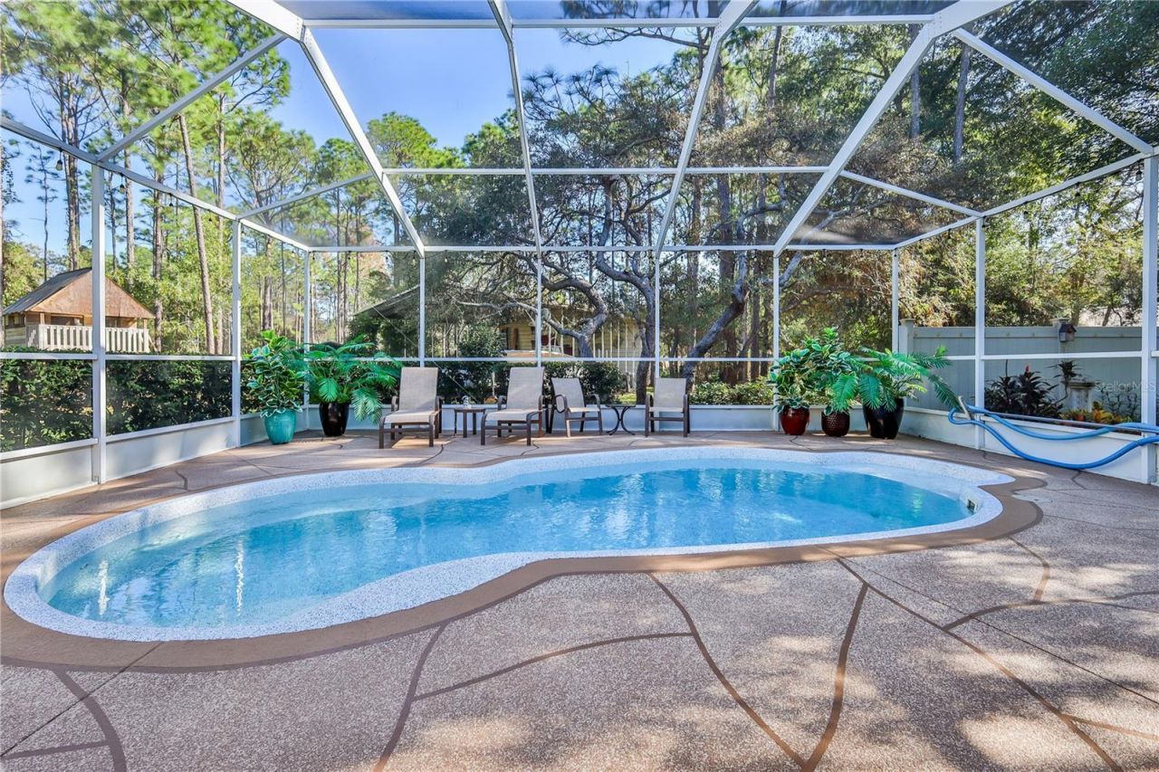 Welcome to this extraordinary custom estate on 1.38 beautifully landscaped acres, offering timeless design, exceptional craftsmanship, furnished and unmatched level of detail. From the moment you arrive, the circular driveway, manicured grounds, and inviting front porch set the tone for what's inside. Enter through double leaded-glass doors into a home filled with natural light, plantation shutters, and luxury vinyl plank flooring throughout the main living areas. To the right, a formal dining r...Welcome to this extraordinary custom estate on 1.38 beautifully landscaped acres, offering timeless design, exceptional craftsmanship, furnished and unmatched level of detail. From the moment you arrive, the circular driveway, manicured grounds, and inviting front porch set the tone for what's inside. Enter through double leaded-glass doors into a home filled with natural light, plantation shutters, and luxury vinyl plank flooring throughout the main living areas. To the right, a formal dining room features a dormer window, elegant chandelier, and crown molding. To the left, behind a pocket door, is a private office/den with its own dormer window ideal for work or reading. The spacious living room serves as the heart of the home, centered around a wood-burning fireplace with blower, recessed lighting, and ceiling fan. The owner describes this space as ''reminiscent of Montana'' with its warm, lodge-like charm. The kitchen is designed for both form and function, showcasing custom cabinetry with pull-out shelves, drawers, stainless steel appliances, gas cooktop with downdraft vent, double sink, and eating area overlooking the garden. All lighting is on dimmers for ambiance and energy efficiency. A large laundry/mudroom connects to the oversized 21/2-car garage and includes a sink, refrigerator, cabinets, storage closet, and access to the central vacuum system. The epoxy-finished garage also houses the standby generator with automatic transfer switch powered by a 250-gallon propane tank, which also fuels the gas cooktop. The In-Law Suite offers its own private entrance, kitchen (electric cooktop, microwave, refrigerator, dishwasher, double sink), living/dining area with French doors to the lanai, bedroom with large walk-in closet, and bathroom with wheel-in snail shower, linen closet, and single vanity. The primary suite features high ceilings, a California Closet system, and a luxurious bathroom with pool access, jetted tub, walk-in shower with rain head, private water closet, and abundant storage. Two additional guest bedrooms share a full bathroom with linen closet, tub/shower comb. Step outside to the screened lanai, featuring vinyl windows, three ceiling fans, and eight LED Bluetooth speaker lights, the perfect spot to relax or entertain beside the in-ground heated, saltwater pool. The fire pit table is included, along with 18 automatic exterior lights that illuminate the home each evening. Outdoors, you'll also find a fenced garden with chicken coop, a remote solar gate to the backyard, and multiple outbuildings: A 30' x 40' steel workshop with power, fan, and overhead door and parking for boat or RV, an additional garden shed and a playhouse. Practical enhancements include: two HVAC units, two hot water heaters (cast-iron tank with new elements), well with double holding tanks, two septic systems, a new leach field (4 years old), and underground utilities. The home also features adjustable electrical circuits, Cat-5 high-speed wiring, Christmas light outlets on dormers, and fully lit and decked attic spaces for ample storage. Built for strength and peace of mind, the home sits on 20-foot underpinned pylons and includes an energy-efficient design throughout. This remarkable property blends comfort, craftsmanship, multi-generational versatility, and comes furnished with the exception of some personal items. A true one-of-a-kind estate. Too many details to list here -must be seen to fully appreciate.